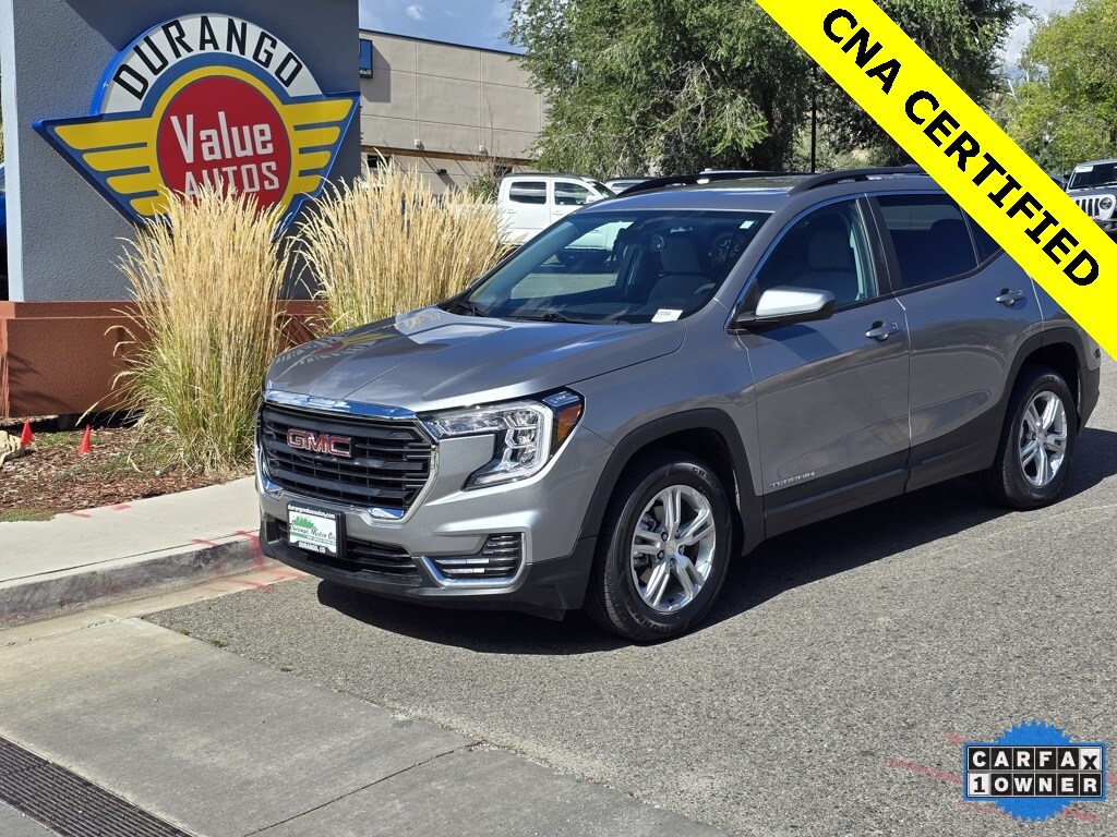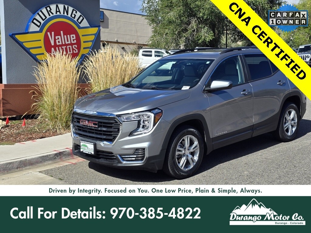 Certified! 2023 GMC Terrain SLE AWD 9-Speed Automatic 1.5L DOHC One Owner, AWD, 2 USB Data Ports w/Auxiliary Input Jack, 4-Wheel Disc Brakes, 6-Speaker Audio System Feature, 8-Way Power Driver Seat Adjuster, ABS brakes, Auto High-beam Headlights, Bluetooth® For Phone, Brake assist, Driver & Front Passenger Heated Seats, Driver Convenience Package, Dual-Zone Automatic Climate Control, Electronic Stability Control, Lane Departure Warning System, License Plate Front Mounting Package, Low tire pressure warning, Power Driver Lumbar Control, Preferred Equipment Group 3SA, Radio: GMC Infotainment Audio System w/7" Display, Remote Start, Roof-Mounted Luggage Rack Side Rails, SiriusXM Radio, Steering wheel mounted audio controls, Wireless Apple CarPlay/Wireless Android Auto.