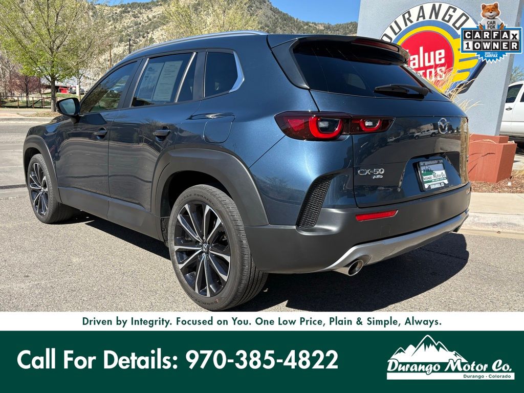 The 2023 Mazda CX-50 2.5 Turbo AWD is a refined and capable crossover that blends performance, style, and versatility for both everyday driving and outdoor adventures. Powered by a 2.5L turbocharged 4-cylinder engine paired with a 6-speed automatic transmission, it delivers strong, responsive performance while maintaining smooth drivability. With standard all-wheel drive, it provides confident handling in a variety of road and weather conditions, making it a great choice for both city commuting and weekend getaways. The exterior, finished in Ingot Blue Mica, is complemented by bold styling elements, 20-inch alloy wheels, and rugged accents that give it a confident and athletic presence. Inside, the black and brown interior offers a premium feel with heated front seats, dual-zone climate control, and a well-designed cabin focused on comfort and functionality. Equipped with advanced safety features like blind spot monitoring, rear cross-traffic alert, and adaptive cruise control, along with practical additions like a power liftgate and cargo package, this CX-50 delivers a perfect balance of performance, comfort, and modern capability.