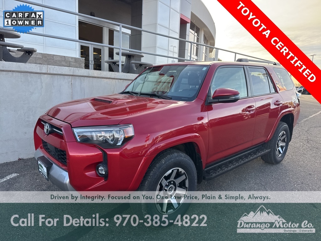 Certified! 2024 Toyota 4Runner TRD Off-Road Premium 4WD 5-Speed with ECT 4.0L V6 DOHC 24V Clean Carfax, One Owner, 4WD, 4-Wheel Disc Brakes, 8 Speakers, ABS brakes, Air Conditioning, AM/FM radio: SiriusXM, Apple CarPlay/Android Auto, Auto High-beam Headlights, Auto-dimming Rear-View mirror, Black Roof Rails, Compass, Electronic Stability Control, Exterior Parking Camera Rear, Front fog lights, Garage Door Opener, Garage door transmitter: HomeLink, Heated Front Bucket Seats, Heated Outside Rear-View Mirrors, Heated steering wheel, Low tire pressure warning, Navigation System, Off Road Package, Off Road Premium Package, Panic alarm, Power driver seat, Power passenger seat, Power windows, Radio: Premium Audio, Rear window defroster, Rear window wiper, Remote keyless entry, Running Boards (TMS), Security system, SofTex Seat Trim, Speed control, Speed-sensing steering, Split folding rear seat, Steering wheel mounted audio controls, Telescoping steering wheel, Tilt steering wheel, Traction control, Wheels: 17" Unique 7-Spoke Off-Road Alloy.